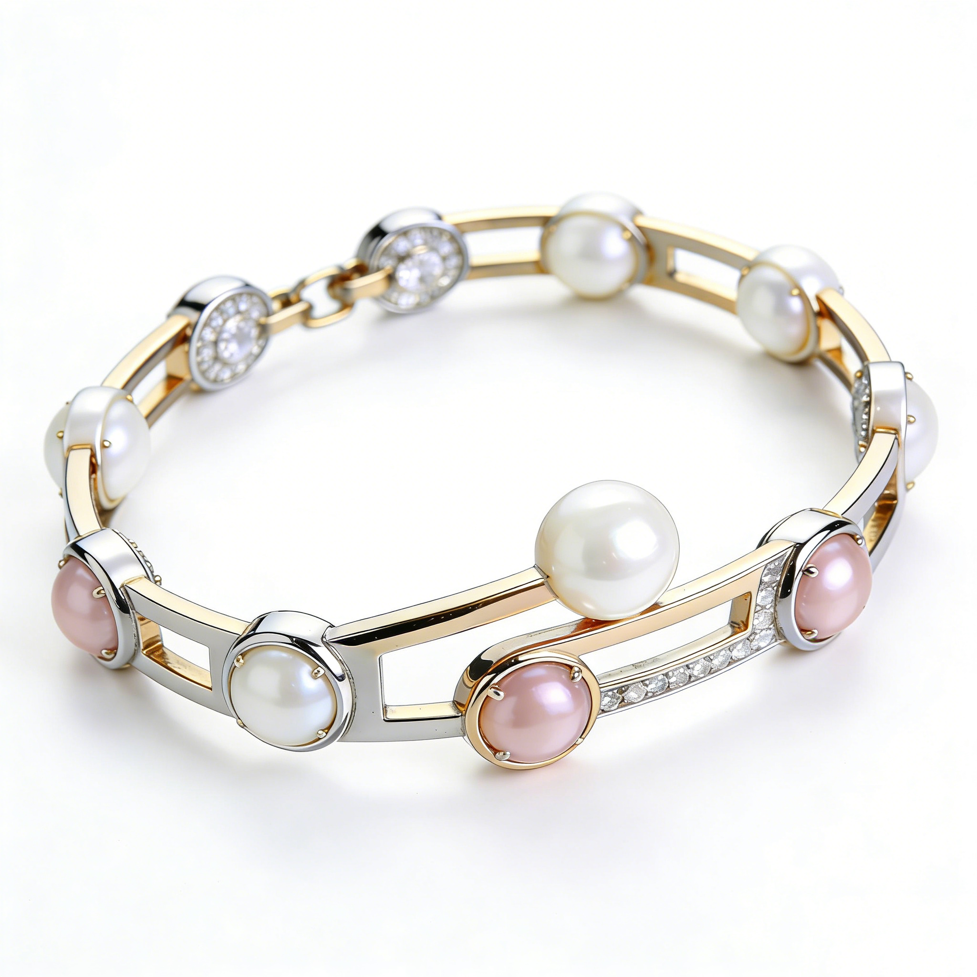 Featuring a polished two-tone silver and gold finish, this link bracelet combines alternating white and pink pearls with small crystal accents for a gentle, romantic glow. The structured link design adds a modern touch, balancing softness and sophistication. It elevates any outfit effortlessly, from everyday jeans and tops to semi-formal dresses. Comfortable and durable, it’s a versatile piece that transitions smoothly from day to evening wear.