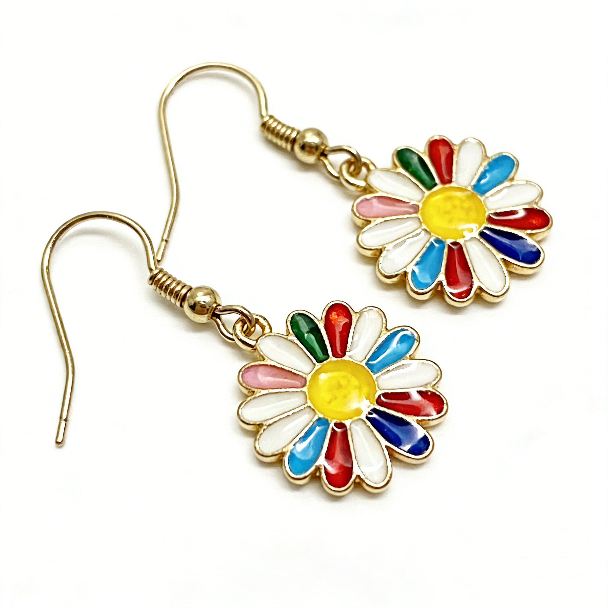These playful drop earrings feature vibrant daisy charms in multicolor enamel, with white petals accented by bold red, blue, green, and pink hues, centered by a bright yellow core. Suspended from slender gold hooks, the daisies swing gently with movement, adding a cheerful, retro-inspired touch. The hypoallergenic hooks ensure comfortable wear, making them perfect for festivals, casual outings, or statement-making everyday looks. Ideal for pairing with colorful tops or minimalist attire, they blend playful whimsy with retro charm, bringing a pop of joy to any outfit.