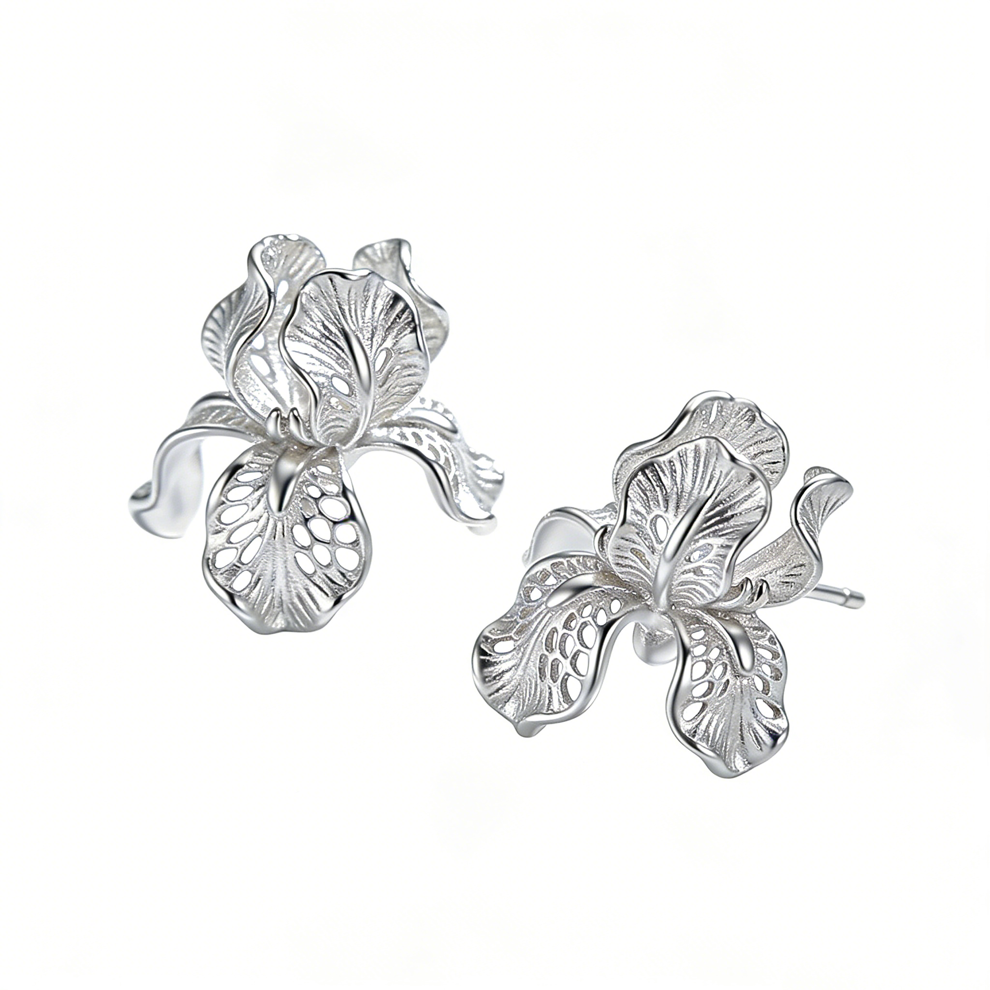 These artistic stud earrings feature intricate silver filigree iris designs, with curved openwork petals etched with vein-like patterns for lifelike texture. The three-dimensional floral shape creates a dynamic, organic silhouette, while the polished silver finish catches light to highlight the filigree’s delicate details. The hypoallergenic posts ensure secure, comfortable wear, making them perfect for formal events or everyday luxury. Blending botanical artistry with vintage filigree craftsmanship, they are a unique, sophisticated addition to any jewelry collection.