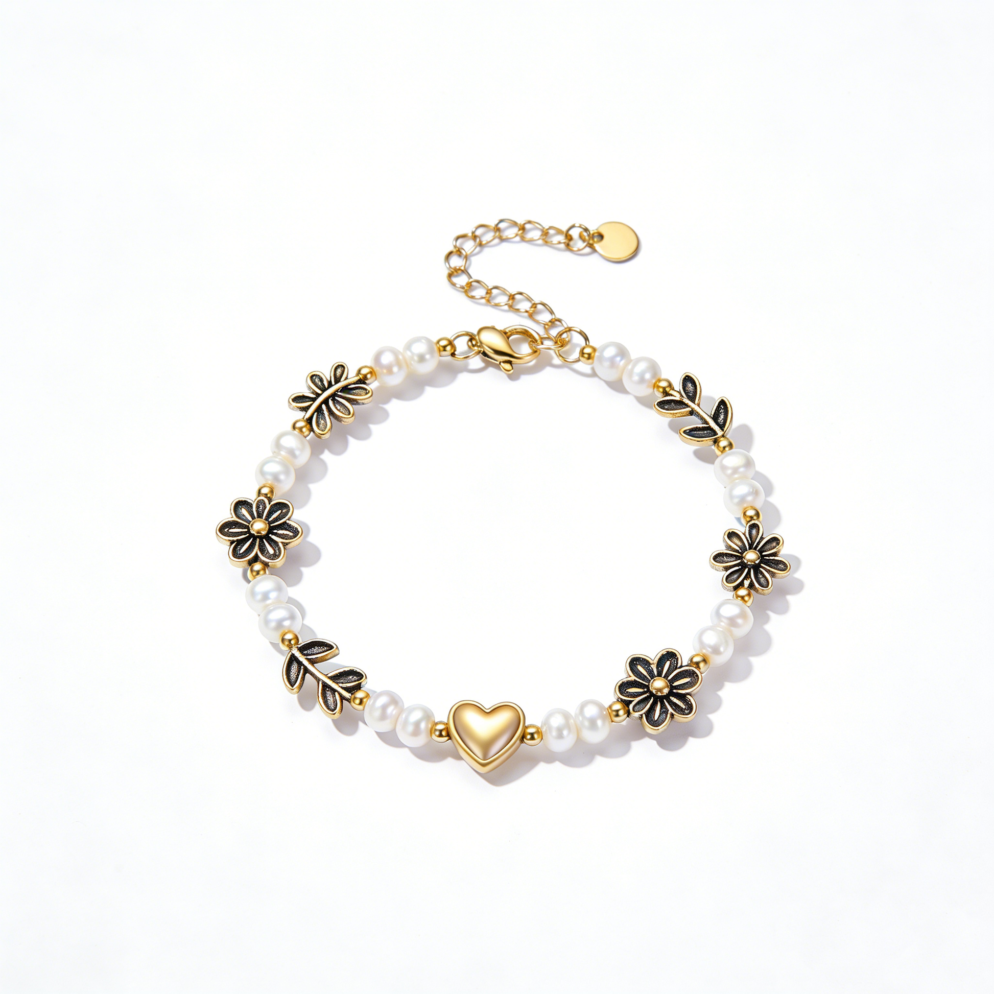 This timeless gold-tone bracelet combines classic white freshwater pearls with vintage-inspired black enamel daisy and leaf charms, centered by a smooth gold heart. The antique-style detailing gives it a warm, nostalgic feel, while the pearls add a touch of classic elegance. The adjustable chain ensures a comfortable fit, and the gold finish complements both casual and dressy outfits. It’s a versatile piece that brings a retro, bohemian vibe to everyday looks, perfect for those who appreciate timeless, feminine jewelry with a touch of whimsy.
